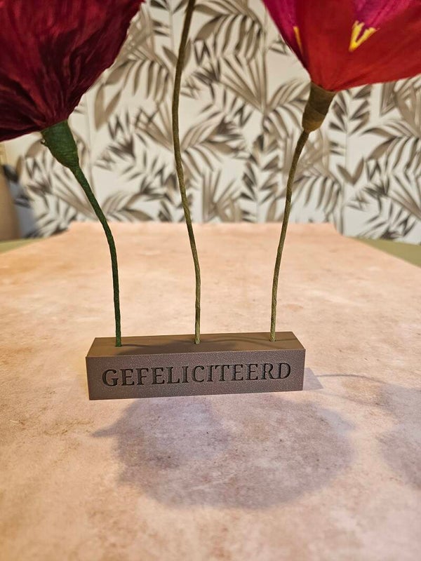 Mooie 3d geprinte houder met daarin drie papieren bloemen.