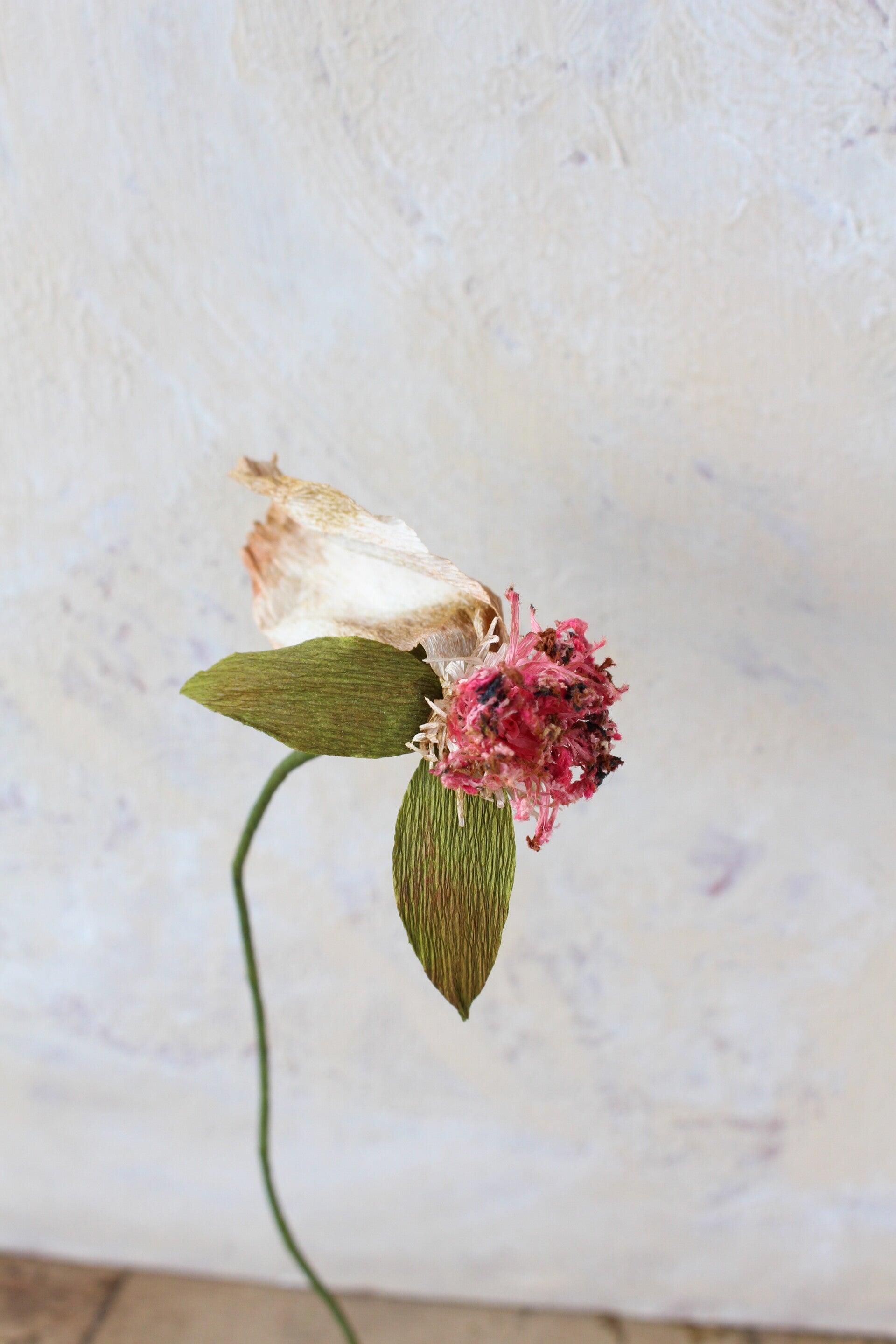 Deze bloemen komen allemaal inclusief afgebeelde houder, de maten variëren. Elke bloem is door het vervaardigingsproces zo uniek dat er geen tweede hetzelfde gemaakt kan worden. Een unieke sculptuur van een vervallen bloem.