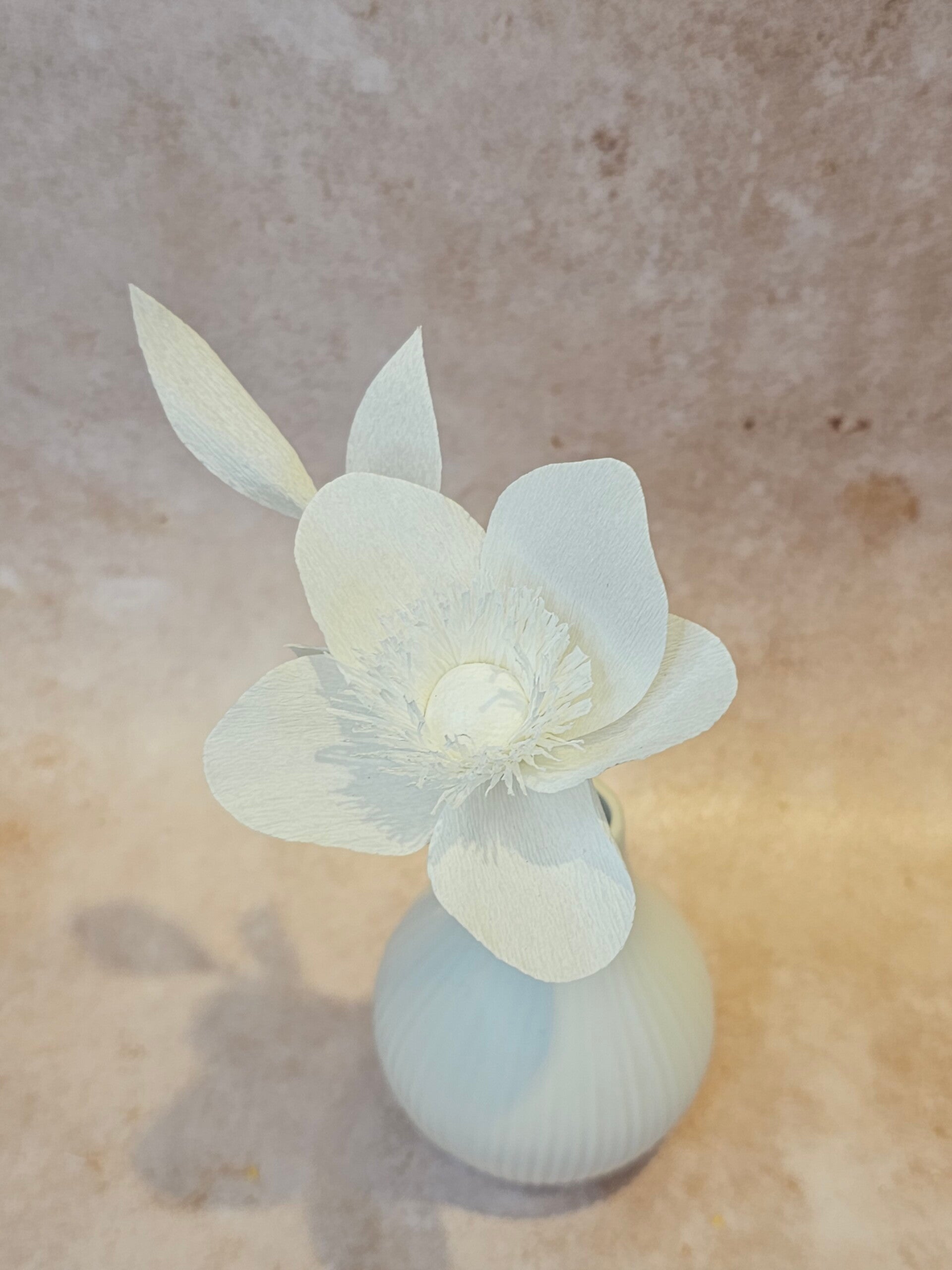 Uit de monochroom serie, een prachtige, kleine anemoon met blad in een klein, keramieken vaasje. Alles prachtig uit een kleur. Precies zodat dit bij iedereen in het interieur past! Heel leuk om meerdere boeketjes te combineren!