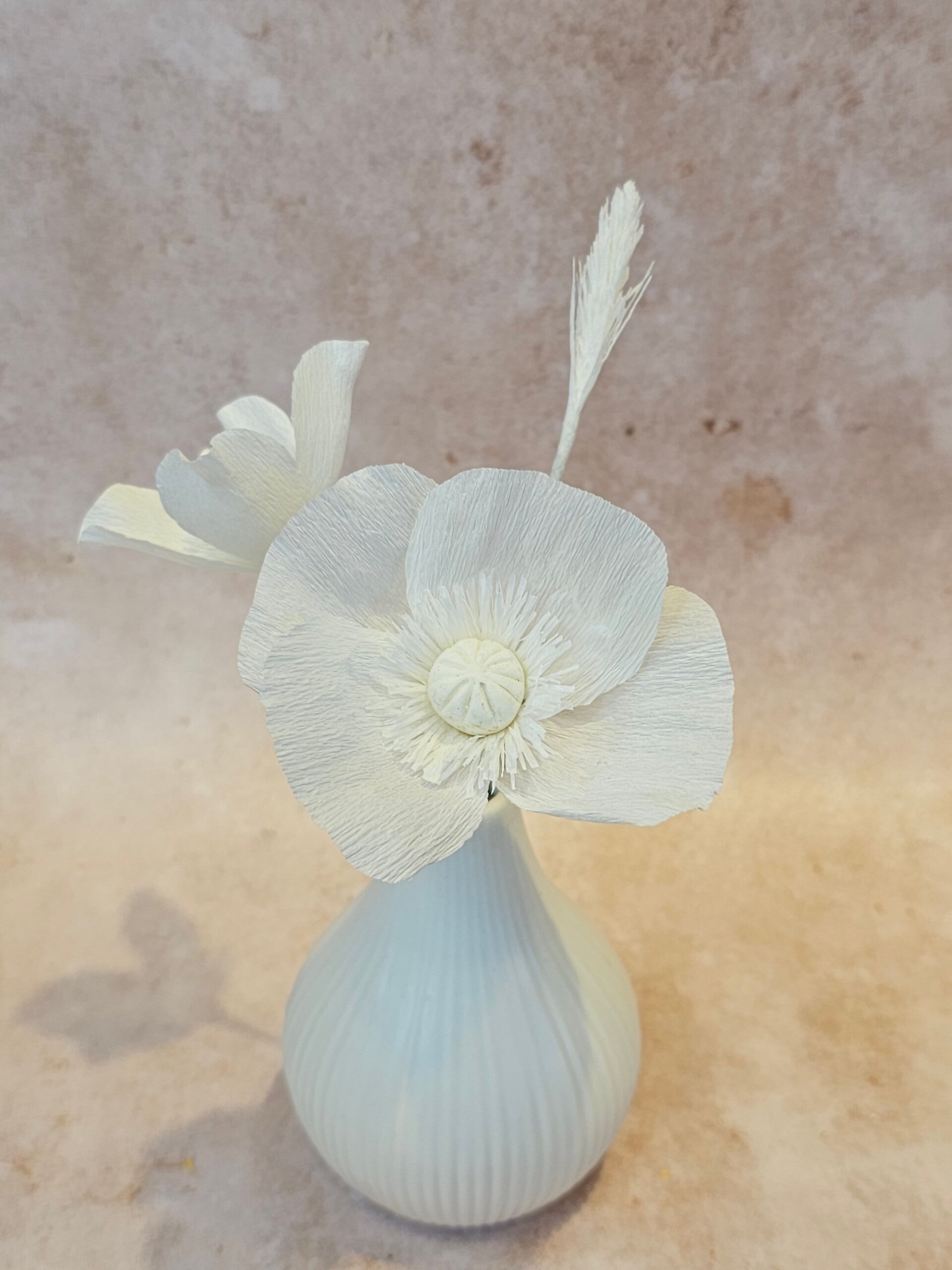 Uit de monochroom serie, een prachtige, kleine boeketje met drie stelen in een keramieken vaasje. Alles prachtig uit een kleur. Precies zodat dit bij iedereen in het interieur past! Heel leuk om meerdere boeketjes te combineren!