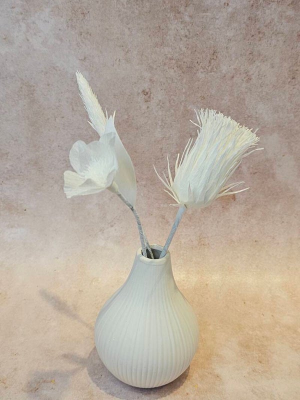 Uit de monochroom serie, een prachtige klein veldboeketje in een klein, keramieken vaasje. Alles prachtig uit een kleur. Precies zodat dit bij iedereen in het interieur past! Heel leuk om meerdere boeketjes te combineren!
