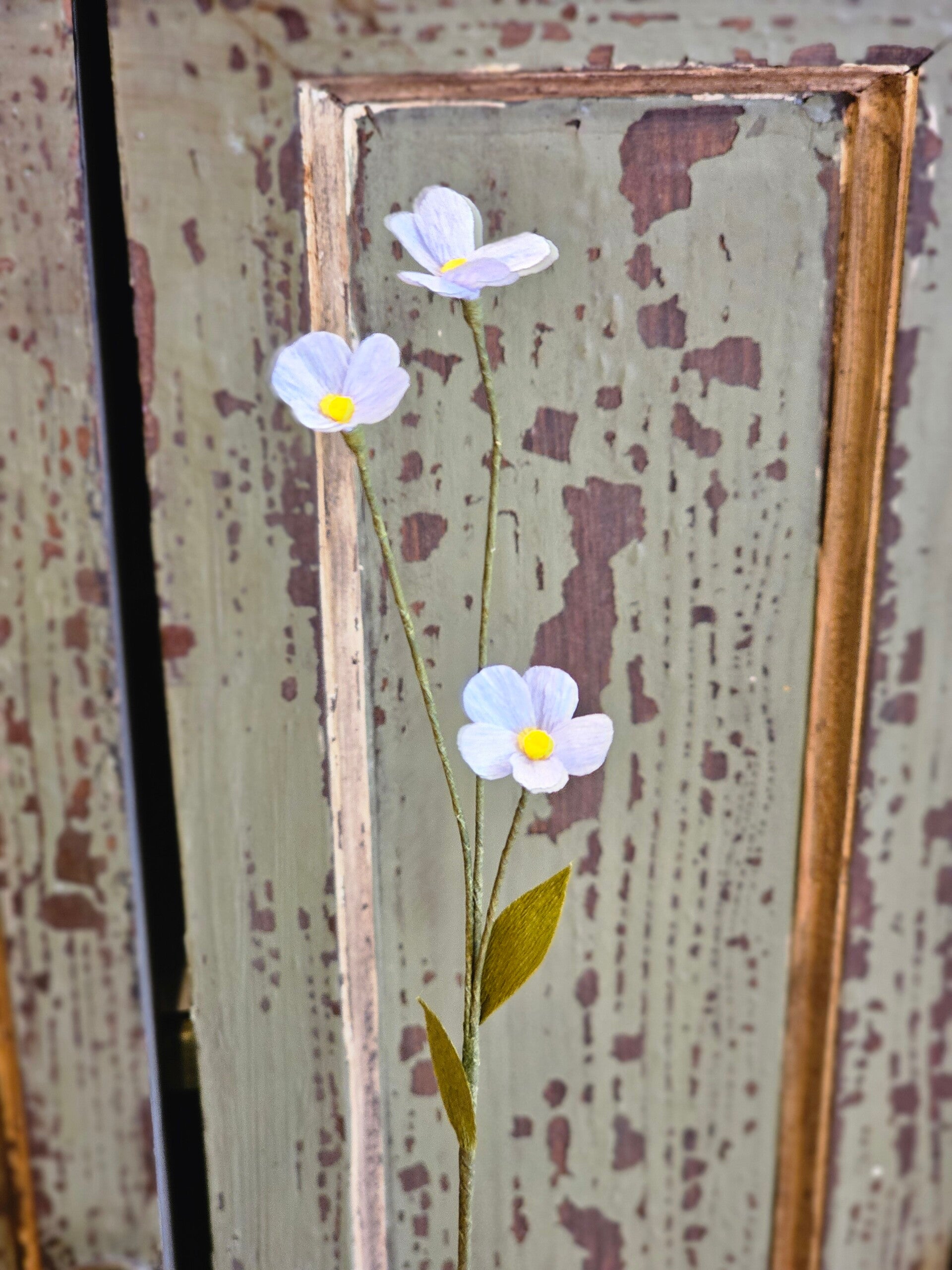 Een verfijnd, handgemaakt papieren vergeet-mij-nietje — klein, symbolisch en onvergetelijk.