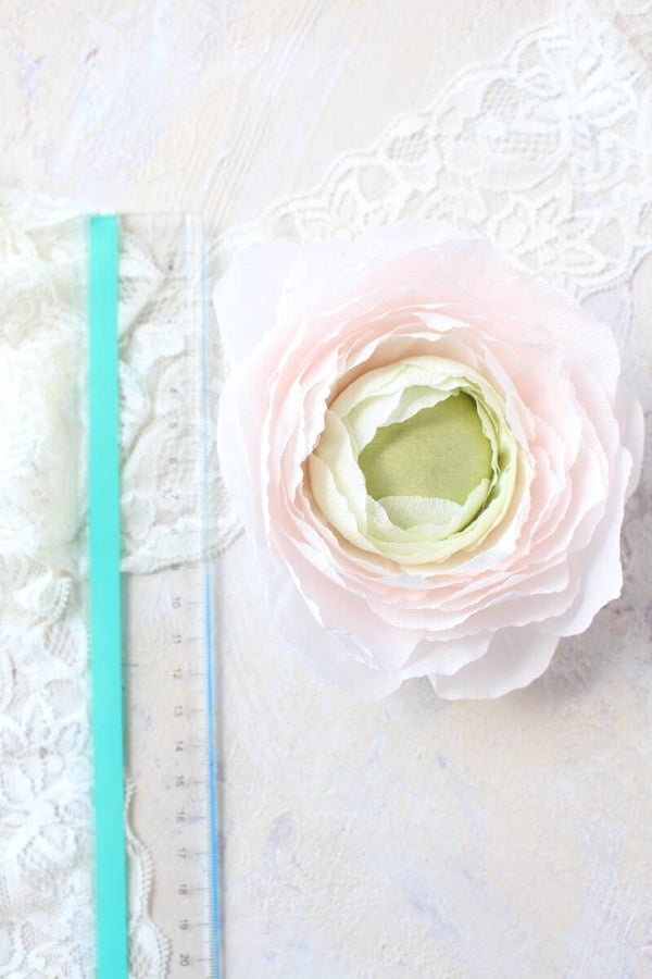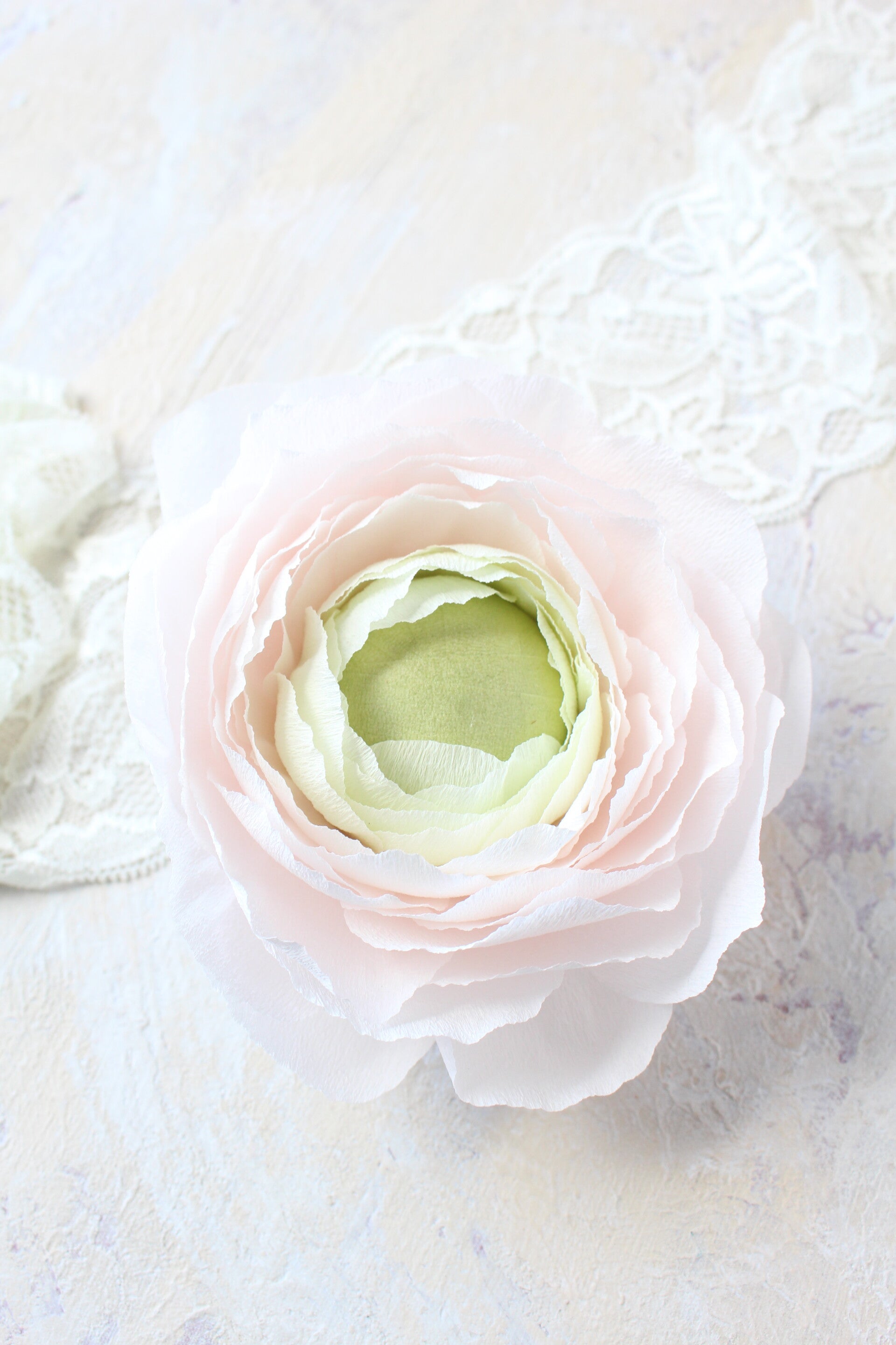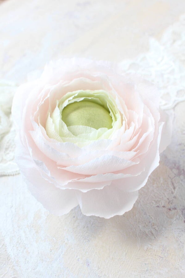 Prachtige ranonkel in wittinten en met groen hart, geeft een mooie zachte en frisse uitstraling aan je (product) fotografie. Tip, plaats hem op een lege waxinelicht en je hebt een ideaal houdertje.