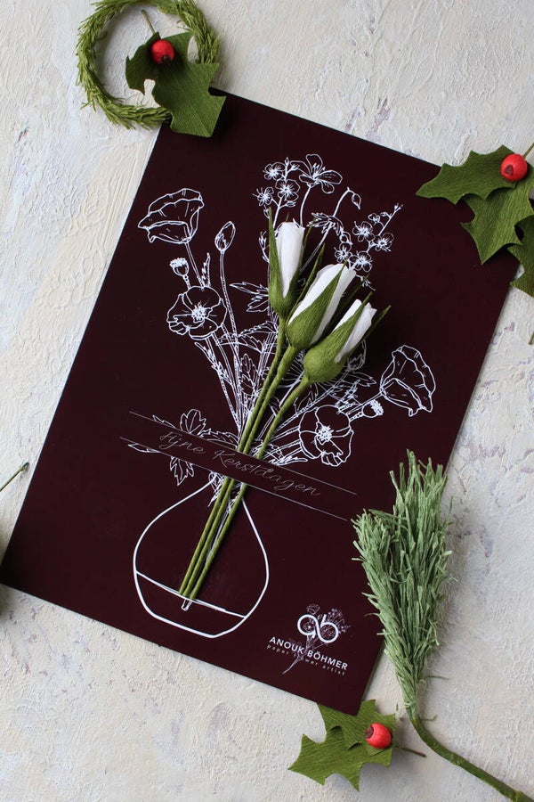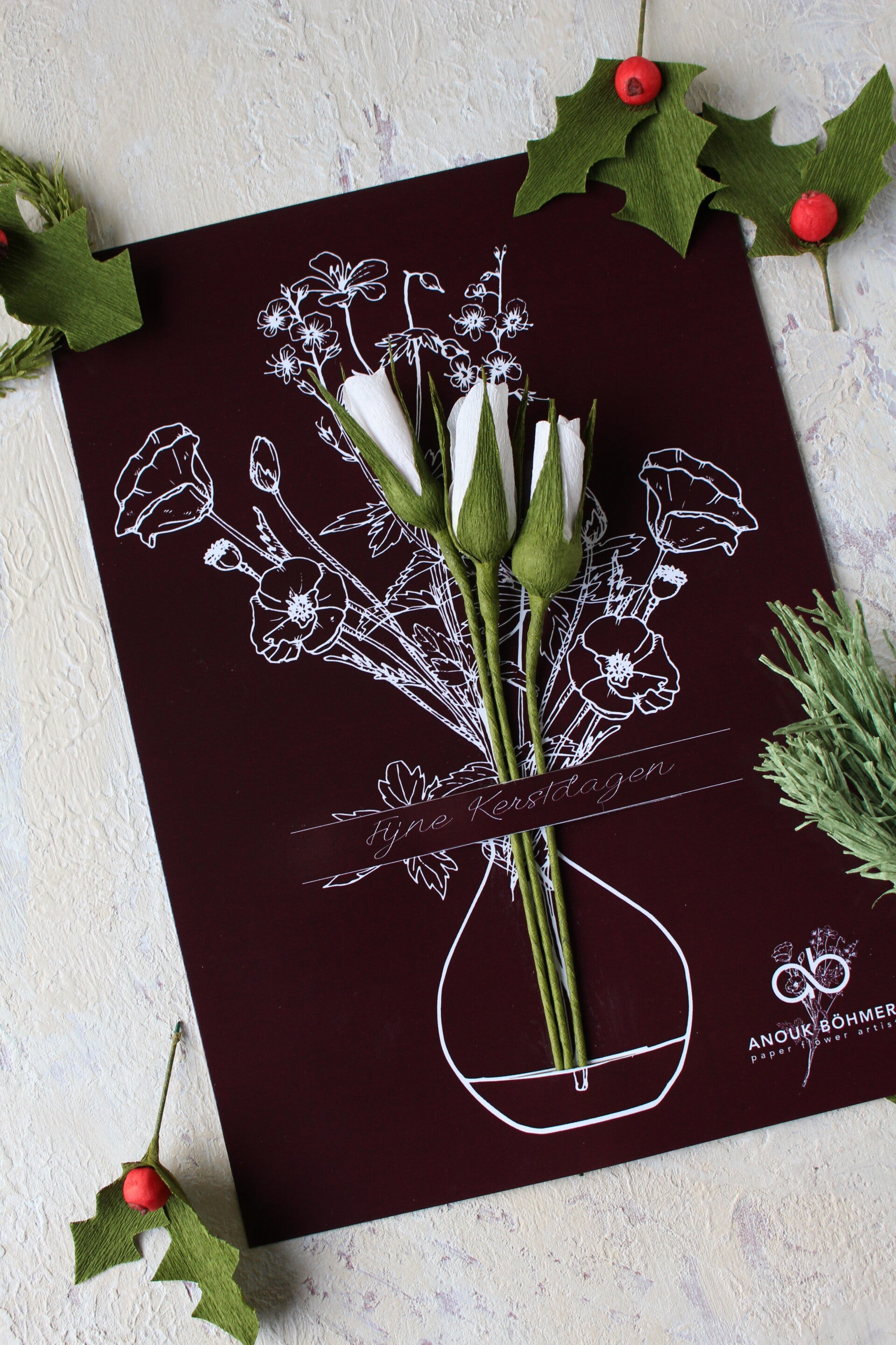 Mooie A5 kaart om op een originele manier te laten weten dat je aan diegene dengt rond de feestdagen. De kaart komt met 3 kleine rozen in knop, een lief kado via de brievenbus!