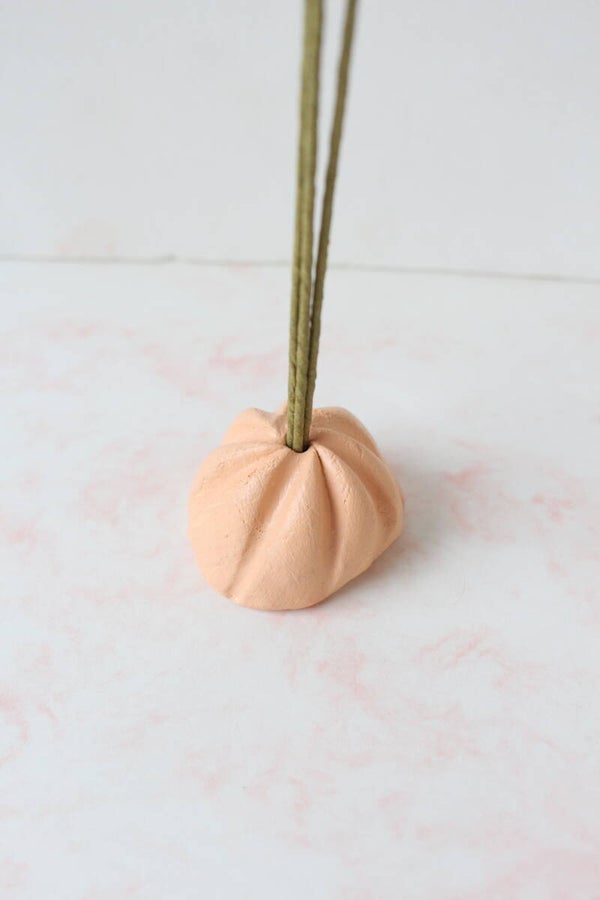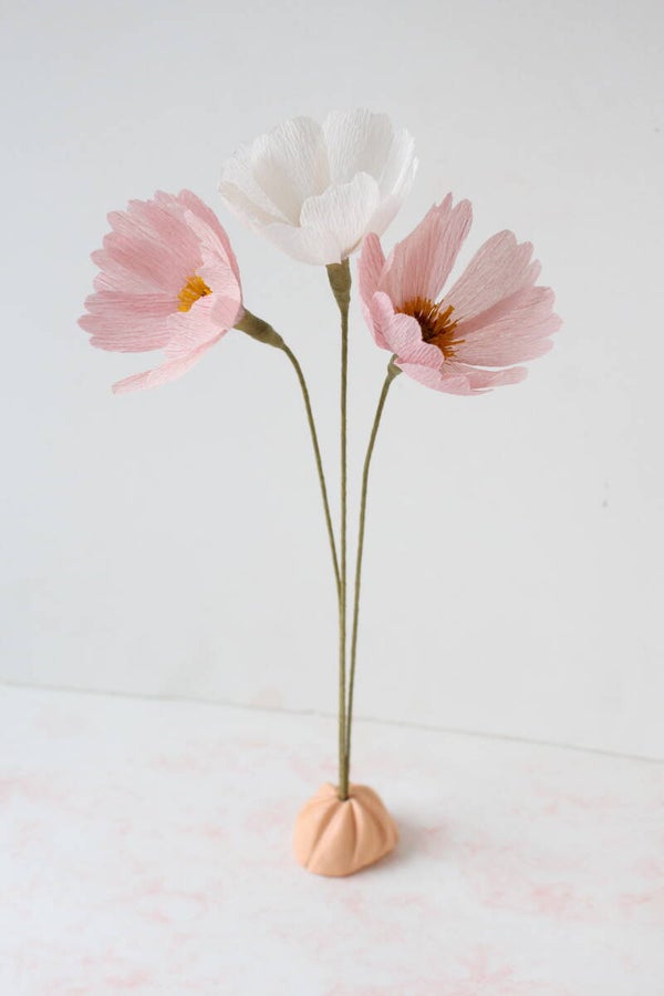 Een boeket hoeft niet altijd groots te zijn om een wow-effect te creëren. Dit boeketje met drie prachtige cosmea's staat geweldig in huis en is ook super om kado te geven. De houder is handgemaakt van klei en daarna geverfd met een acrylverf.