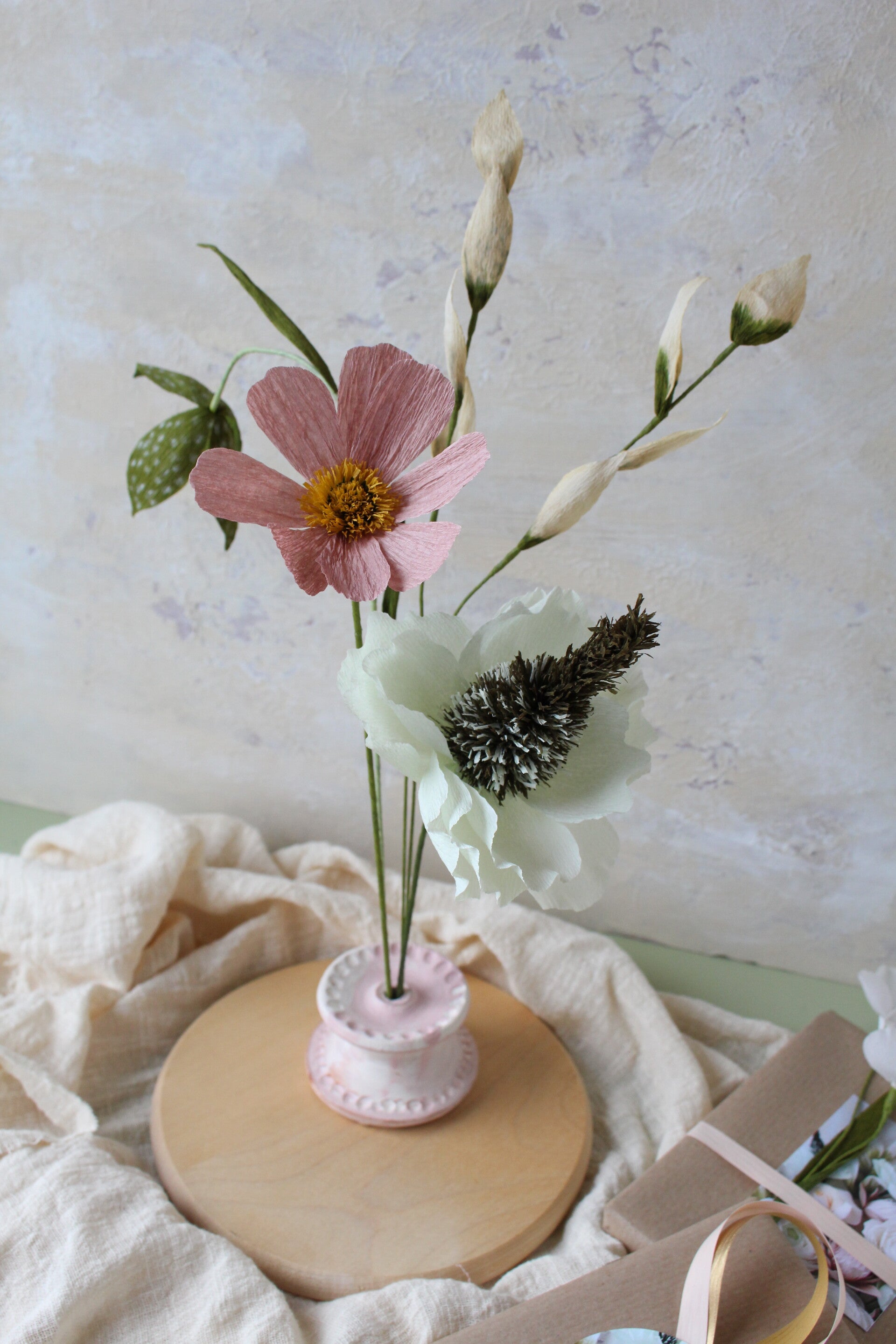 Een van de mooiste samenwerkingen is toch wel samen met Ingrid Wens, zij maakte deze keer de prachtige houders voor mijn papieren bloemen. Eigenlijk koop je dus twee kunstwerken in een keer!