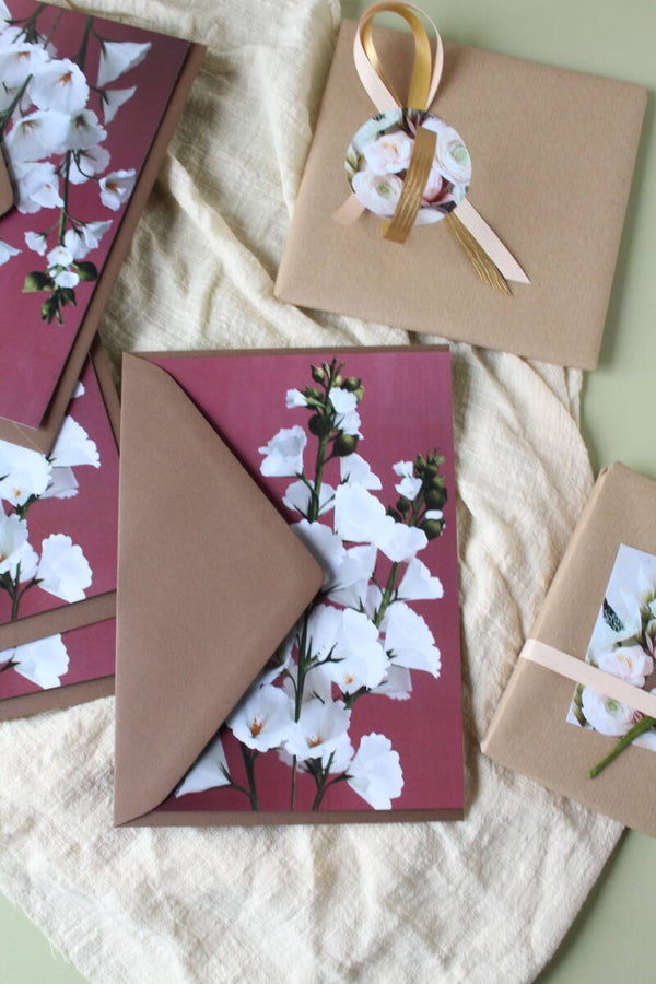 De rode/paarse achtergrond kleur is niet egaal en geeft hierdoor een mooi schilderig effect. Prachtige kaart met blanco achterzijde behalve een klein logo'tje en een lichte pentekening. Je ontvangt de kaart inclusief envelop.