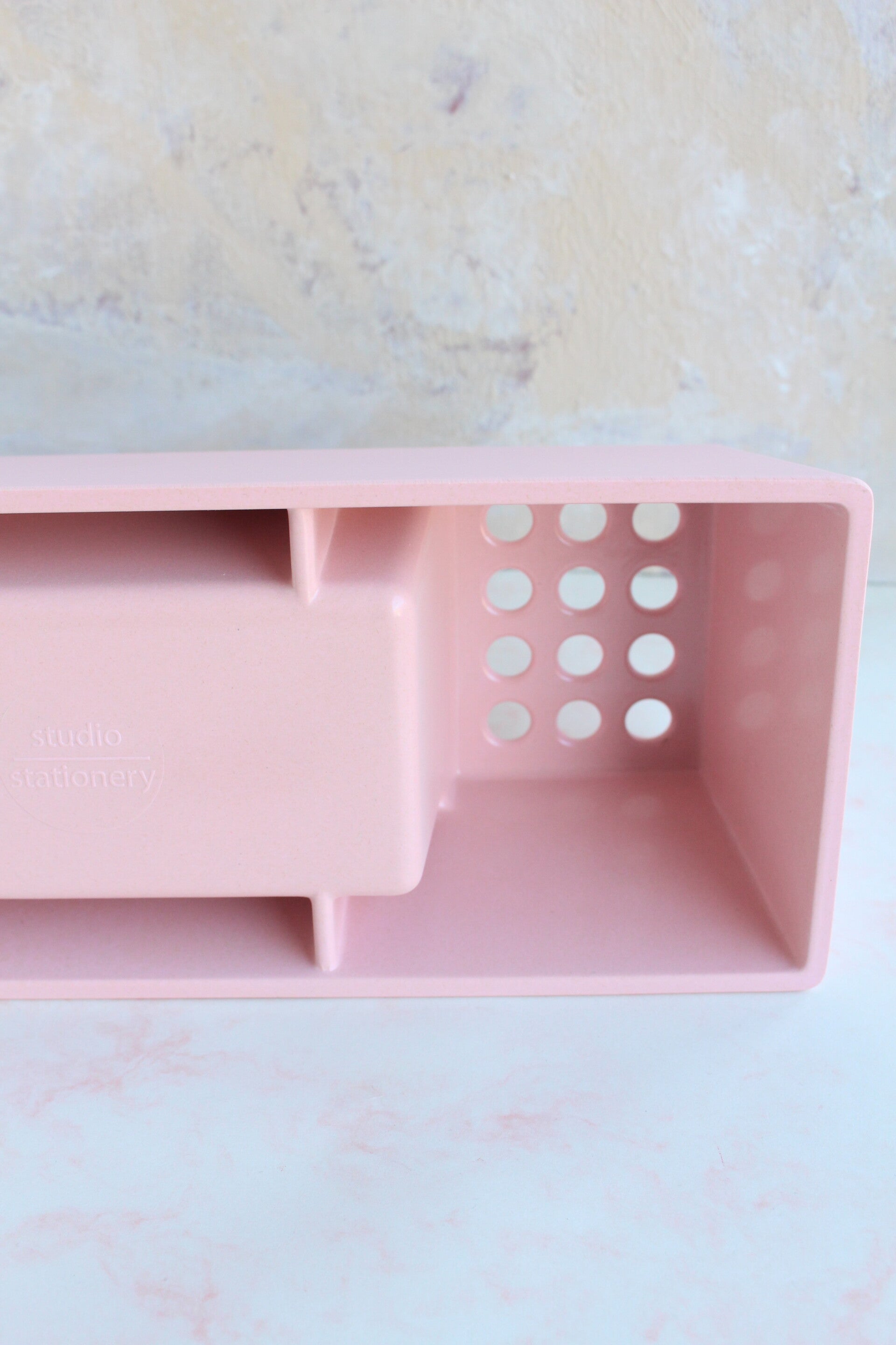 Hele toffe bureau organizer van Studio Stationery, gemaakt van bamboe. Ideaal om je bureau overzichtelijk te houden, met ruimte voor kwasten, papiertjes en scharen. Onder de gaatjes is het open, dus jouw pennen en kwasten steunen op je bureau.