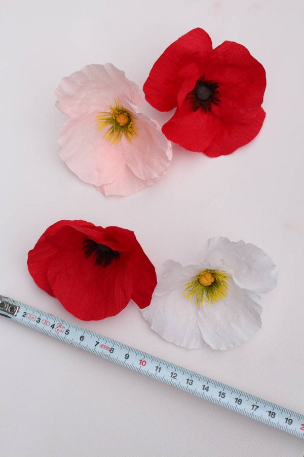 Een mooie mix van twee rode, een licht roze en een witte klaproos.