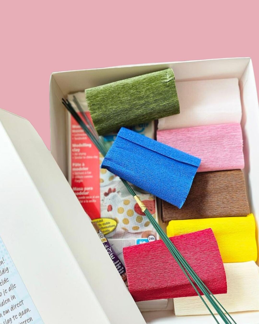 In het startpakket zitten alle materialen die je nodig hebt om te beginnen met een start te maken met het maken van papieren bloemen. Denk aan: tape, lijm, stelen, 8 kleuren papier en klei. De kleuren sluiten goed aan bij de bloemen in het basisboek.
